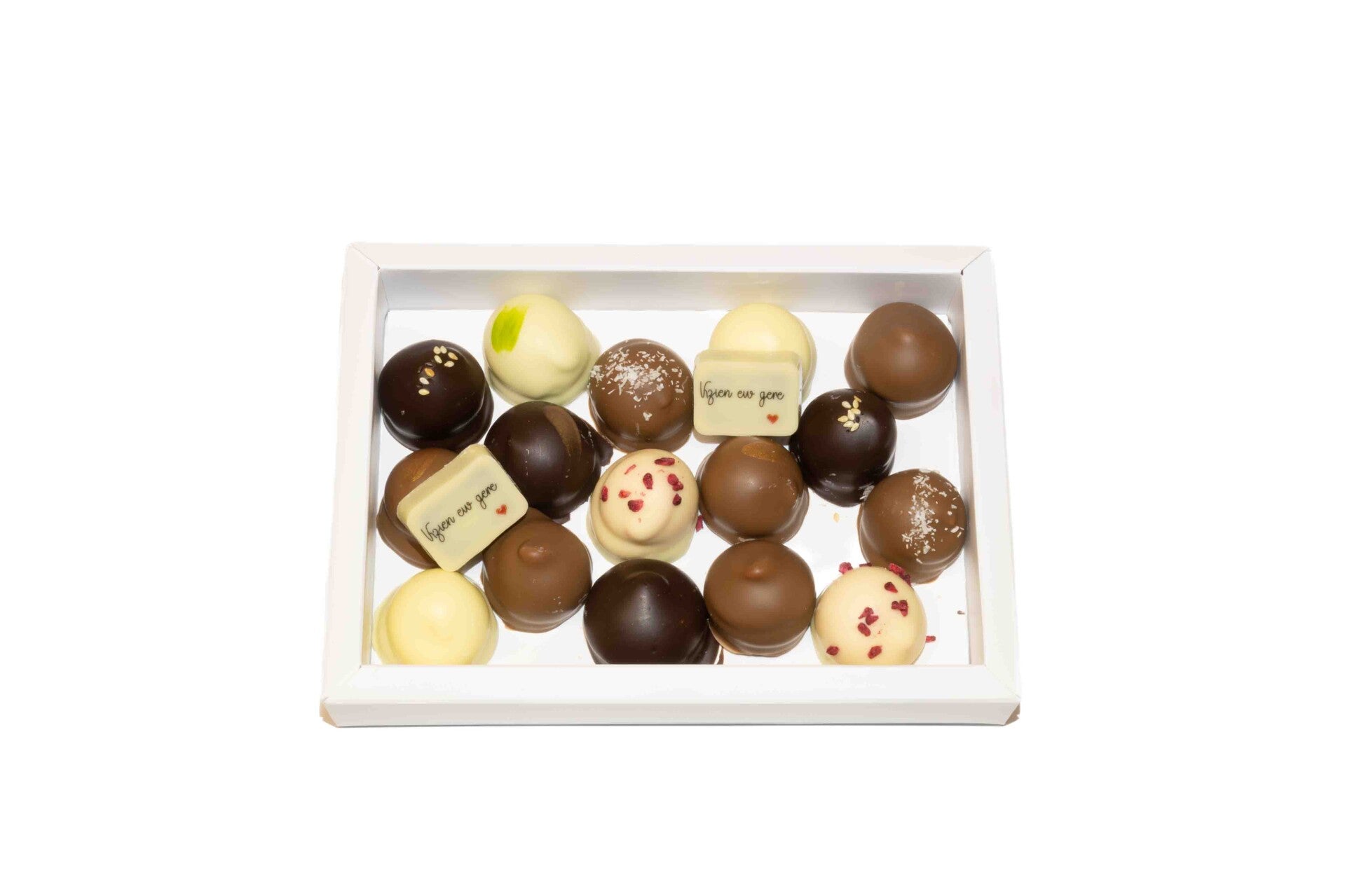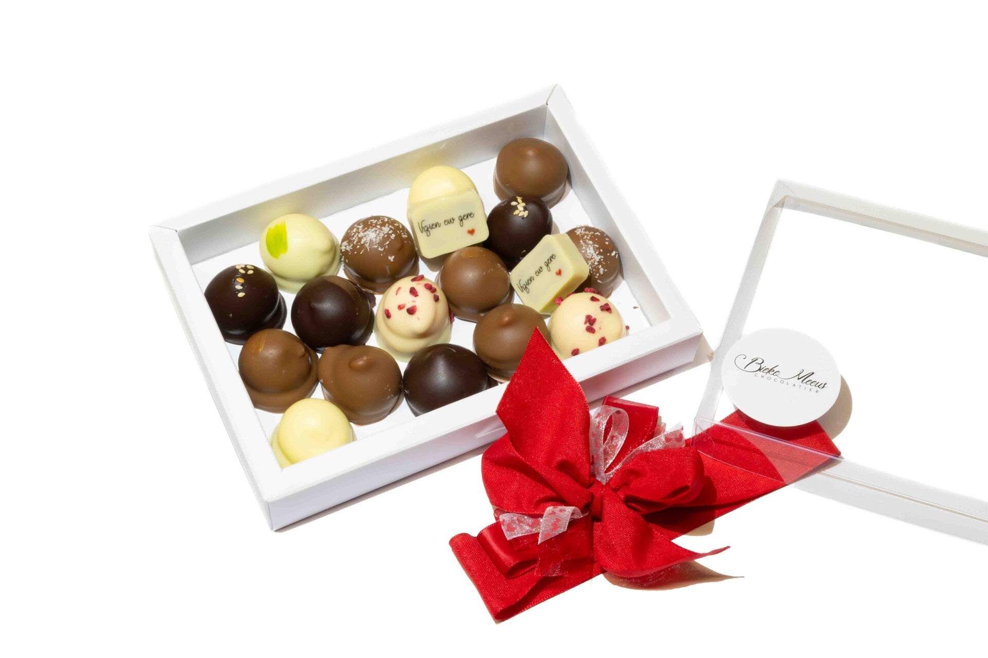 Een doorschijnend luxedoosje gevuld met 16 mini- melo en als extra 2 pralines met liefdevol tekstje, afgewerkt met een mooie strik
