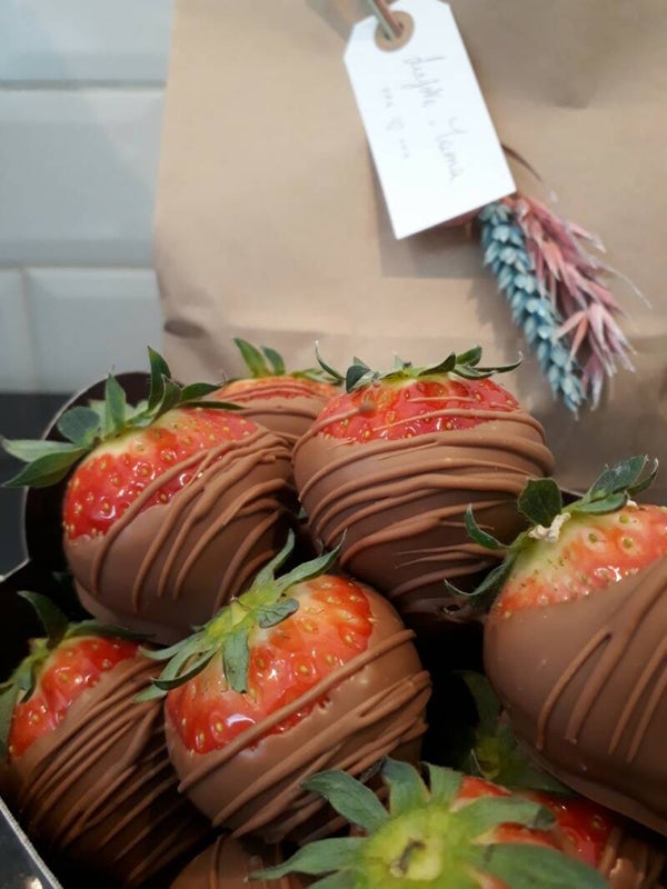 Aardbeien omhuld in Callebaut chocolade met een heerlijke fles Mosecco.