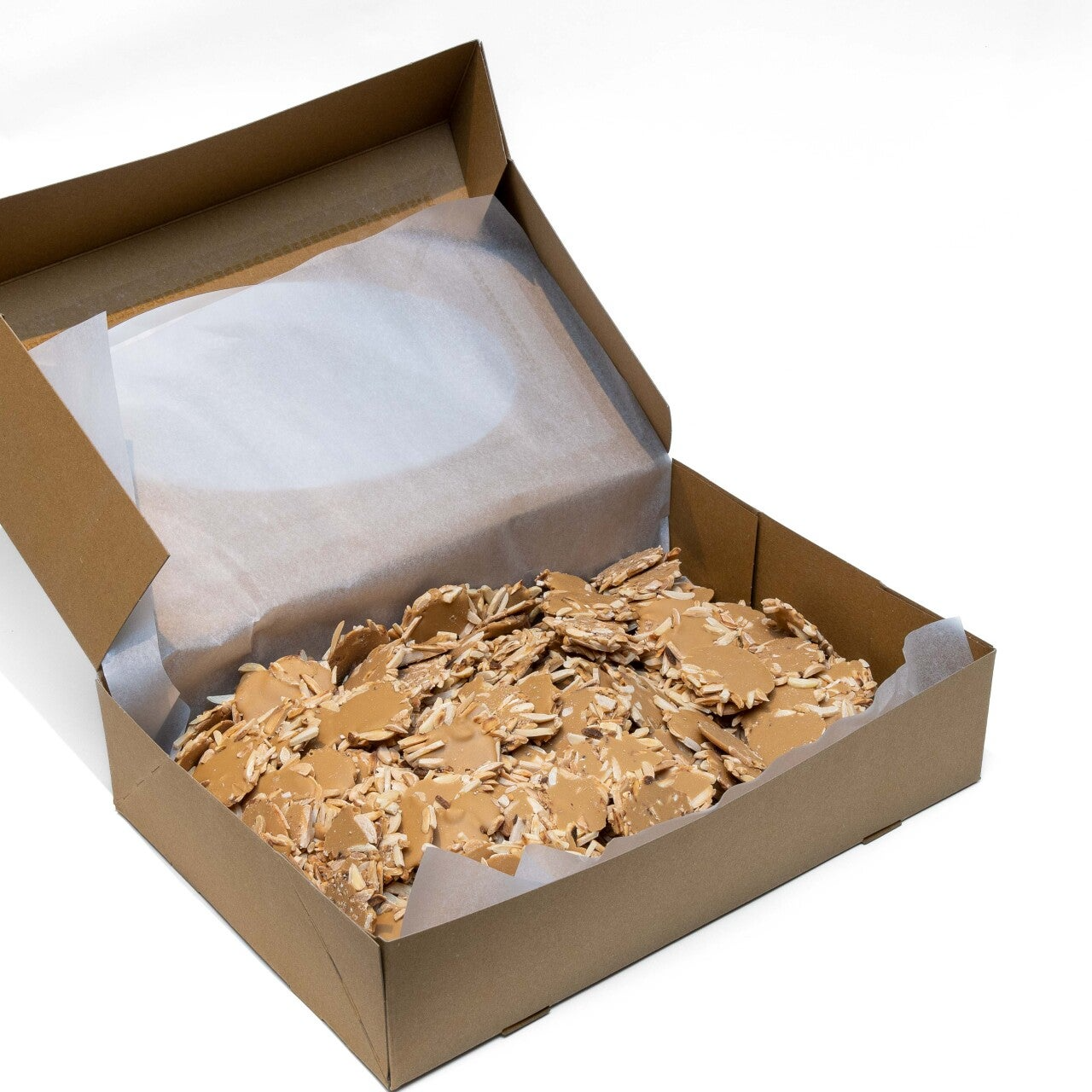 Karamel chocolade plakjes met flakes van maldon zout met geroosterde amandelsnippers