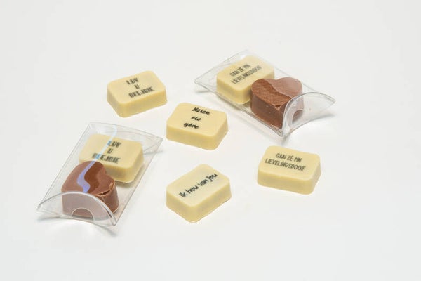 verpakt per 2, 1 praline met tekstje en een hartjes praline met popcorncrispy vulling.